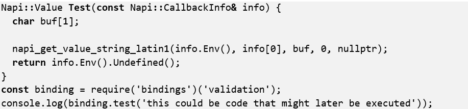 Dapat dilihat di atas, baris code buf diisi dengan non-NULL, sementara buffsize diisi dengan angka 0. Sebagai contoh, malloc (0) tidak menjamin akan menghasilkan nilai NULL. Sebuah npm package bisa saja berjalan dengan benar di satu mesin yang memiliki asumsi malloc(0) = NULL, tetapi bisa juga menyebabkan permasalahan keamanan di host yang berbeda karena memiliki asumsi yang berbeda pula.