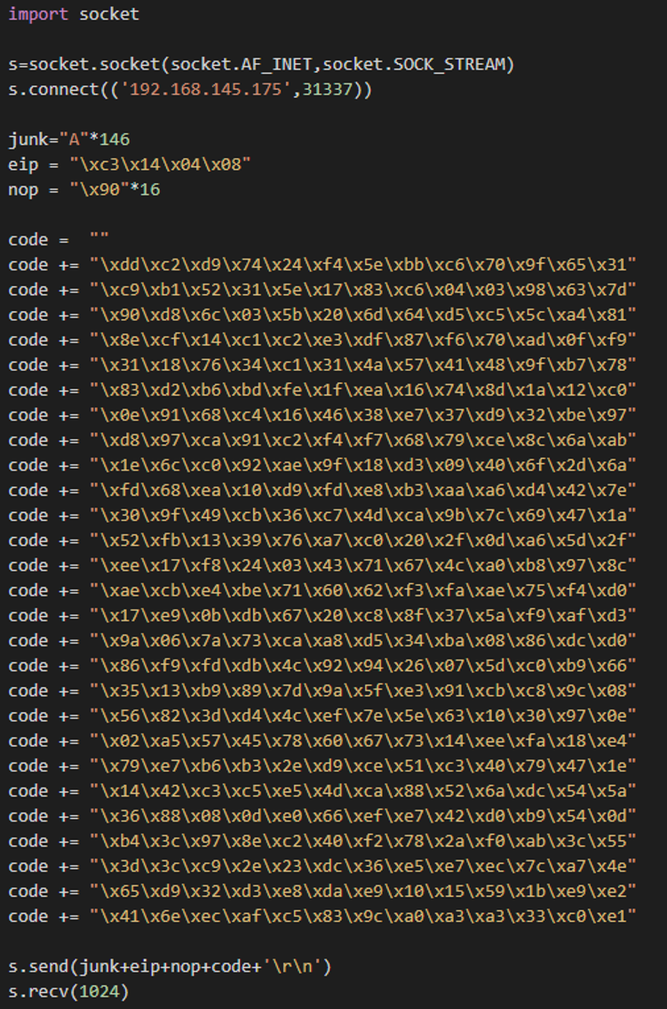 9. Insert a shell program (payload) in the script using metasploit. This can be done by selecting windows/shell_reverse_tcp as payload to run the msfvenom program. It is necessary to inform the IP address and TCP port of the attacker’s computer so that the operating system running dostackbufferoverflowgood can initiate a SHELL connection to the victim’s computer, especially as the payload used is a reverse SHELL. In this tutorial, the attacker’s IP is 192.168.145.177.