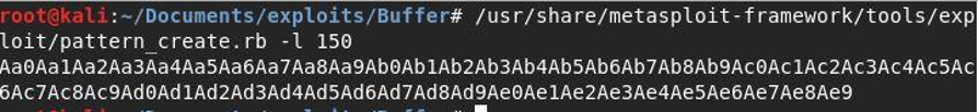 4. Locate where the Extended Instruction Pointer (EIP) is being overwritten by sending a unique character that has 150 bytes in length. The character can be created with the pattern create.rb program from Metasploit.