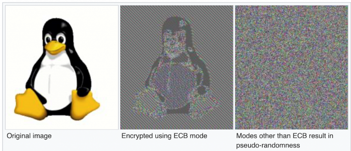 Unfortunately, ECB is not a secure way of encrypting. This is because the blocks of the same data are always mapped to the result, which can leak a lot of information, as shown in the encryption of the famous Linux penguin below: